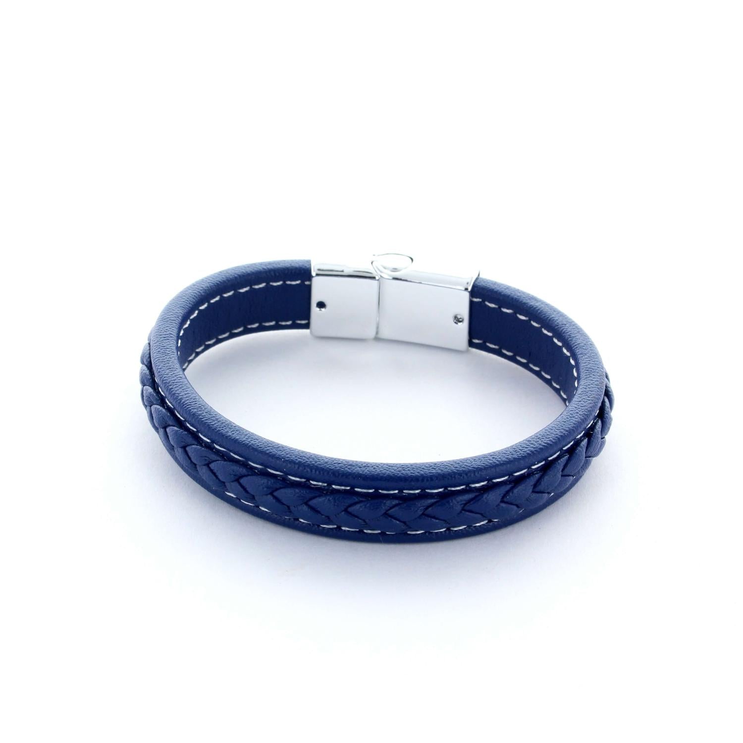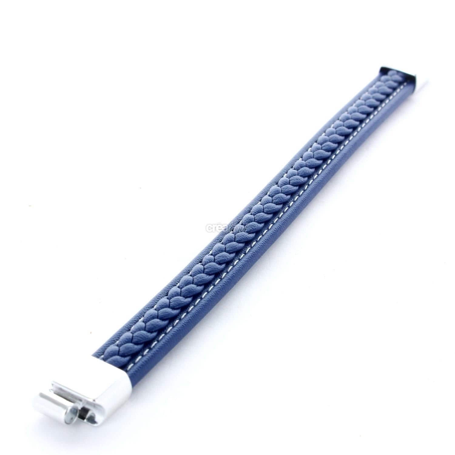 Bracelet chic en cuir bleu cousu et son fermoir coulissant magnétique en acier inoxydable.