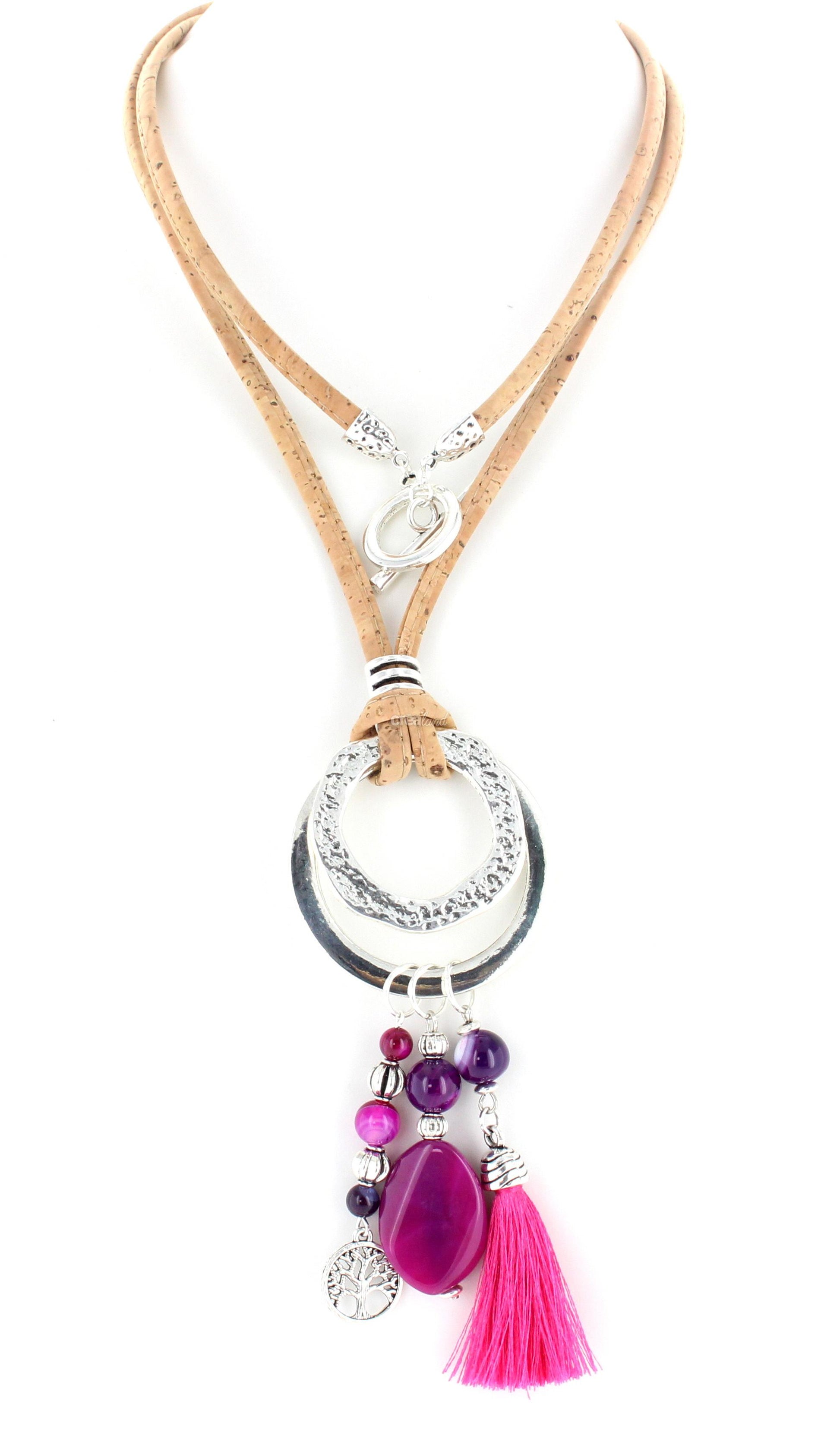 Collier en liège agrémenté de pierres Agate. Des éléments argentés en zamac embelissent le collier.