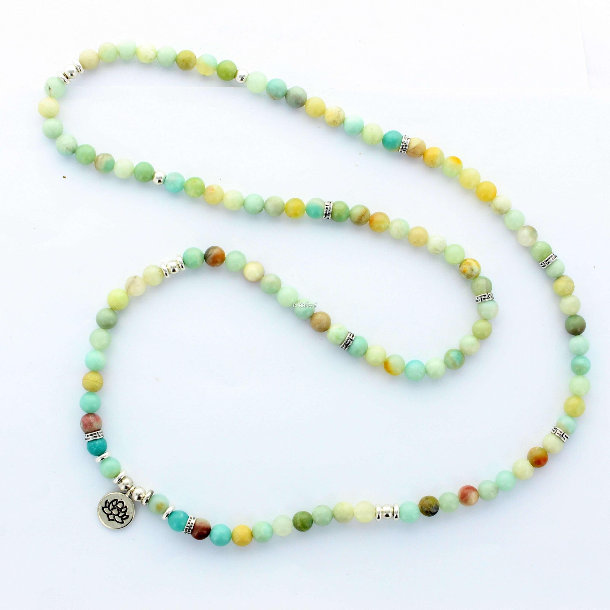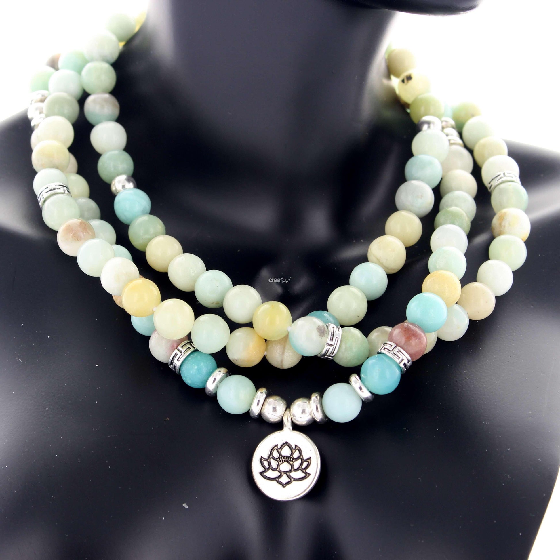 Cet élégant collier Mala avec des pierres naturelles d'Amazonite est vendu avec une pochette de velours noir, il peut se porter en sautoir ou à enrouler autour du poignet.