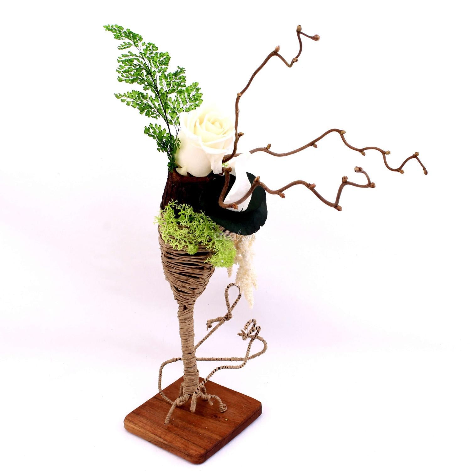 Cette composition florale est composé d'une rose et de feuillages stabilisés.