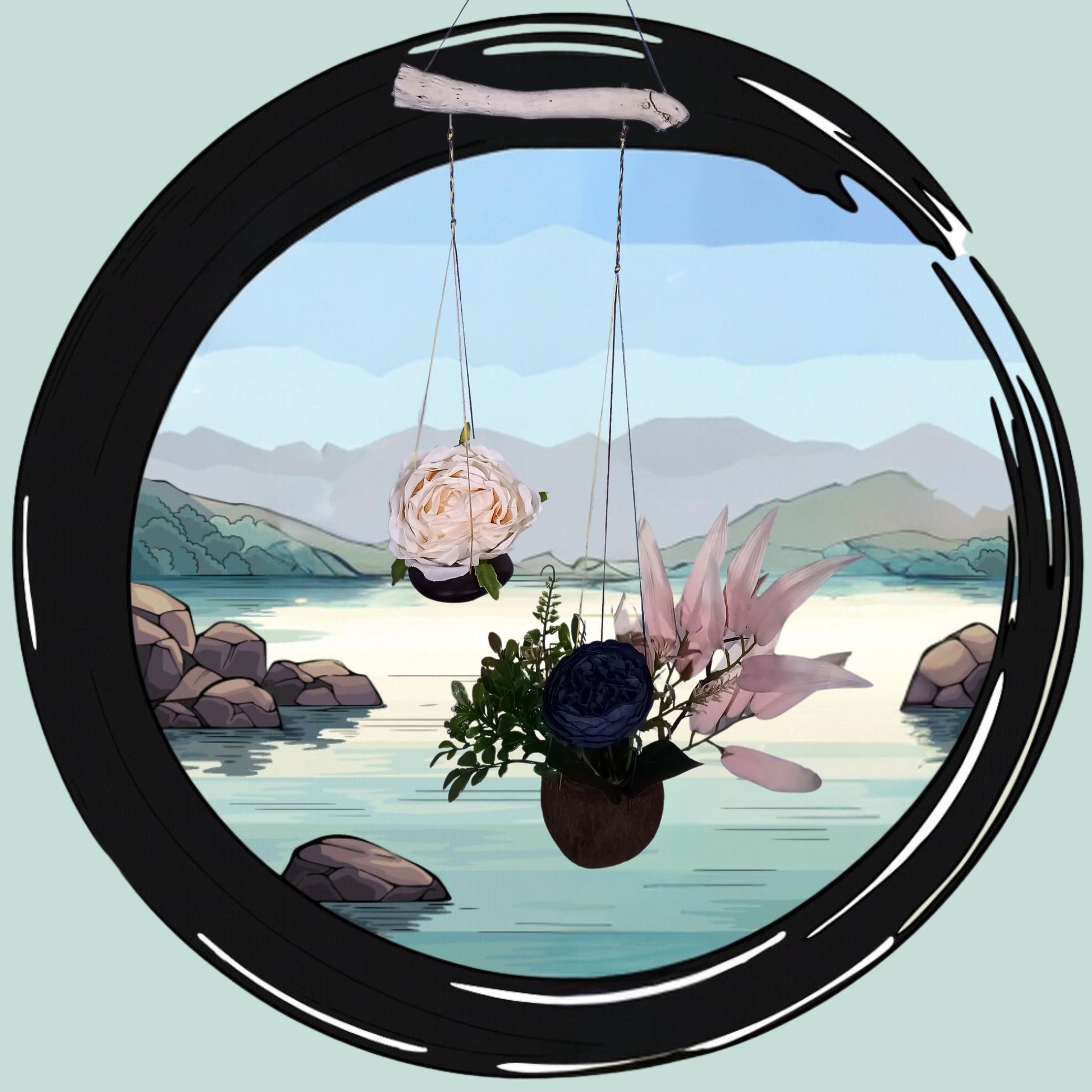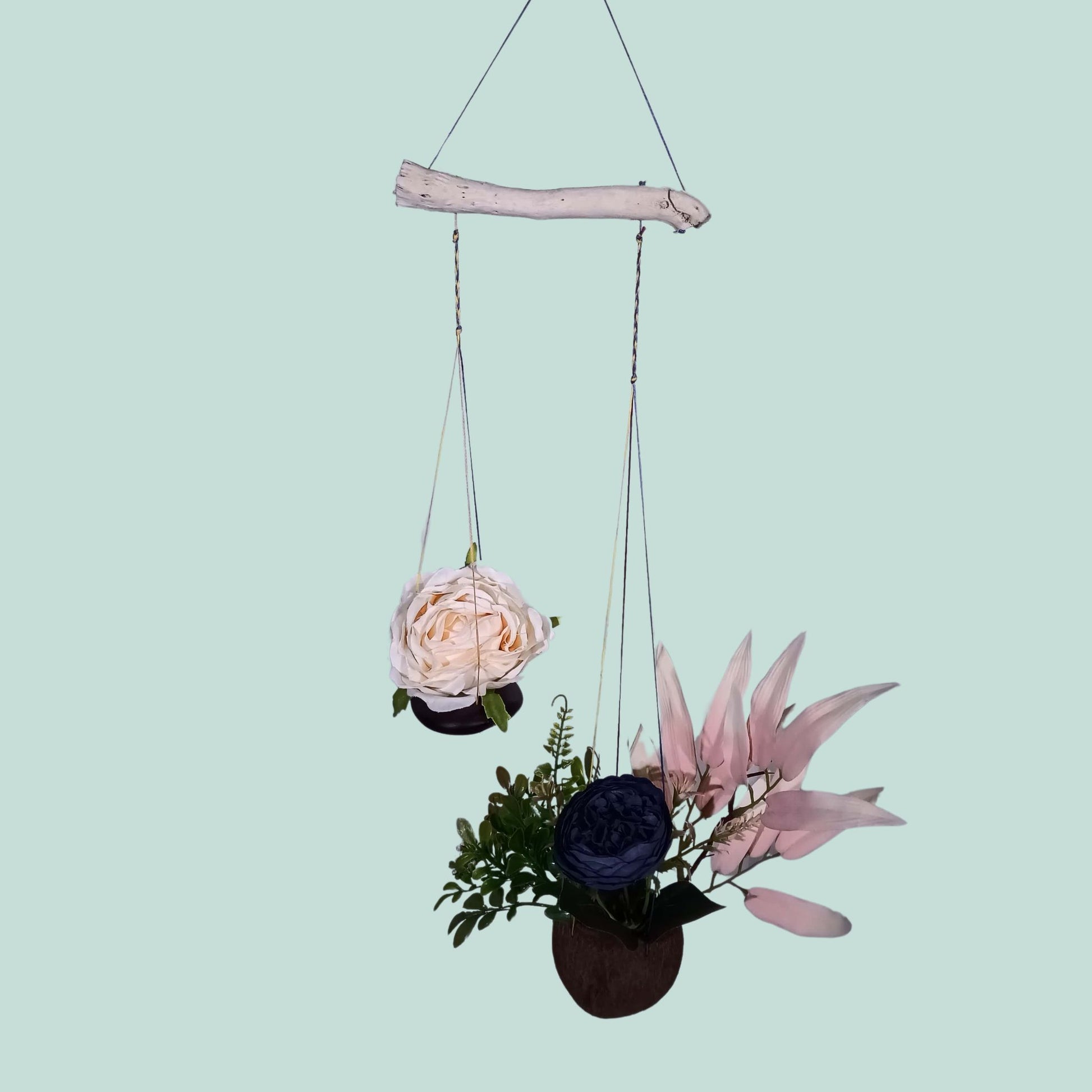 Découvrez notre nouveau jardin suspendu, une création unique et élégante qui apportera une touche de sophistication à votre intérieur. Ce jardin suspendu est réalisé avec une tige de pépé cone de couleur blanc cassé, orné de magnifiques fleurs artificielles en soie.