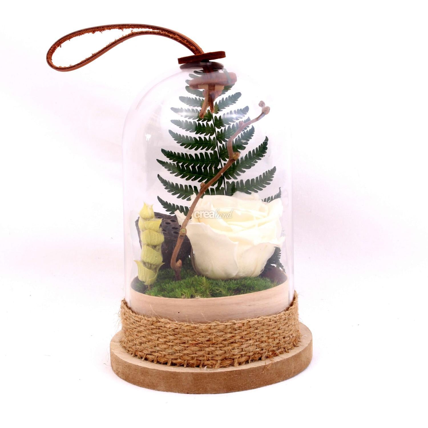 Cette composition florale est composée d'une rose blanche stabilisée sous une cloche plastique, elle est posée sur un lit de mousse ainsi que de différents feuillages stabilisés et éléments secs. Il souffle un vent de décoration durable et écologique dans votre intérieur.