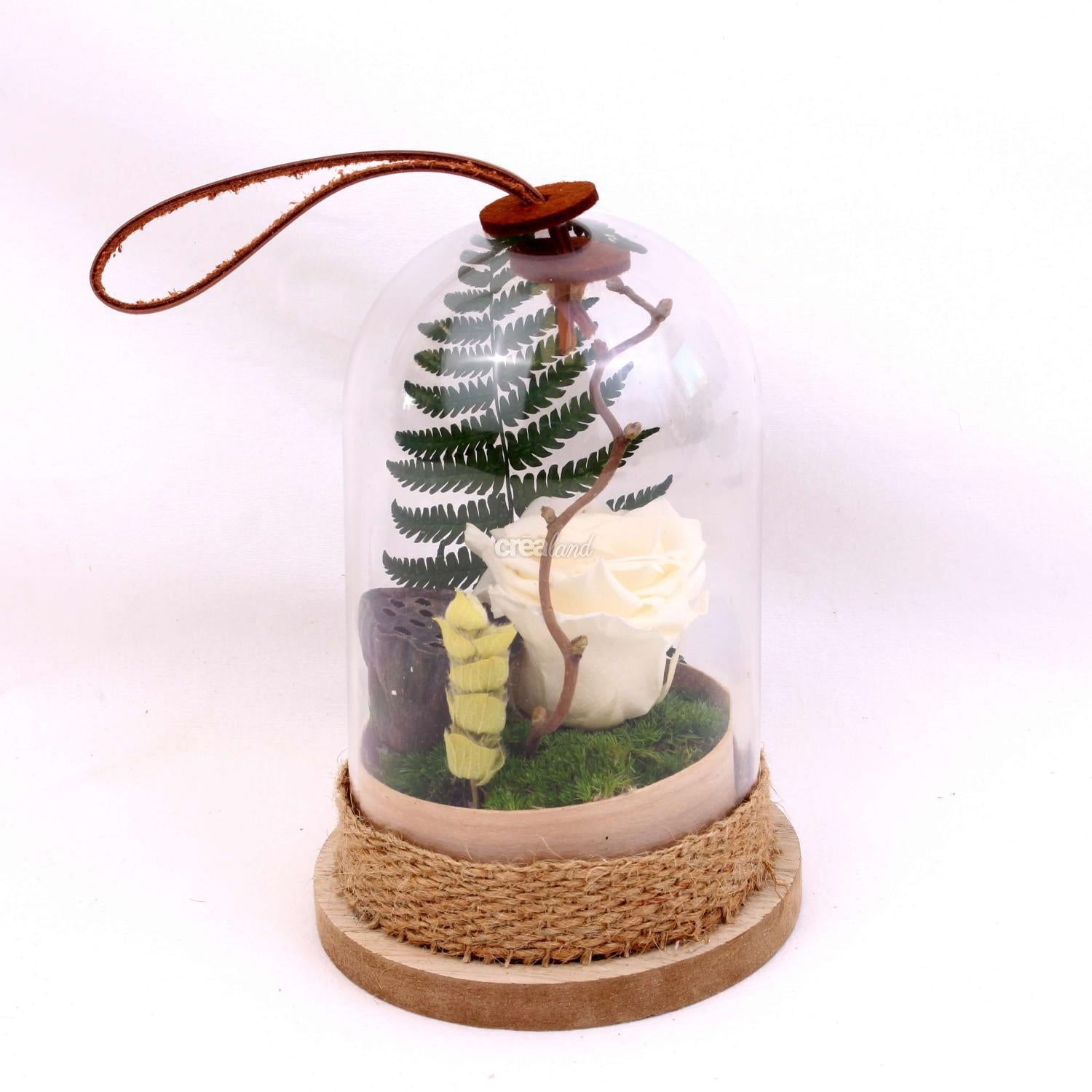 La composition florale d'une 'Rose blanche sous cloche" stabilisée est composée d'éléments stabilisés qui n'aiment pas l'eau ni un endroit humide. Le plein soleil n'est pas idéal non plus.